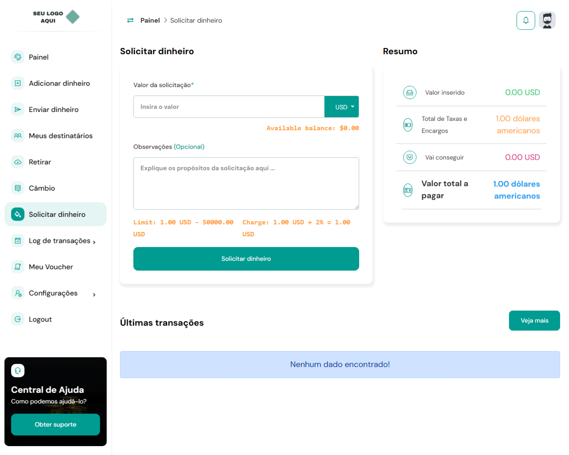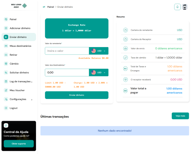 Taxas e encargos: configure e gerencie facilmente as taxas e encargos associados a várias transações, garantindo transparência e controle sobre os custos do usuário.