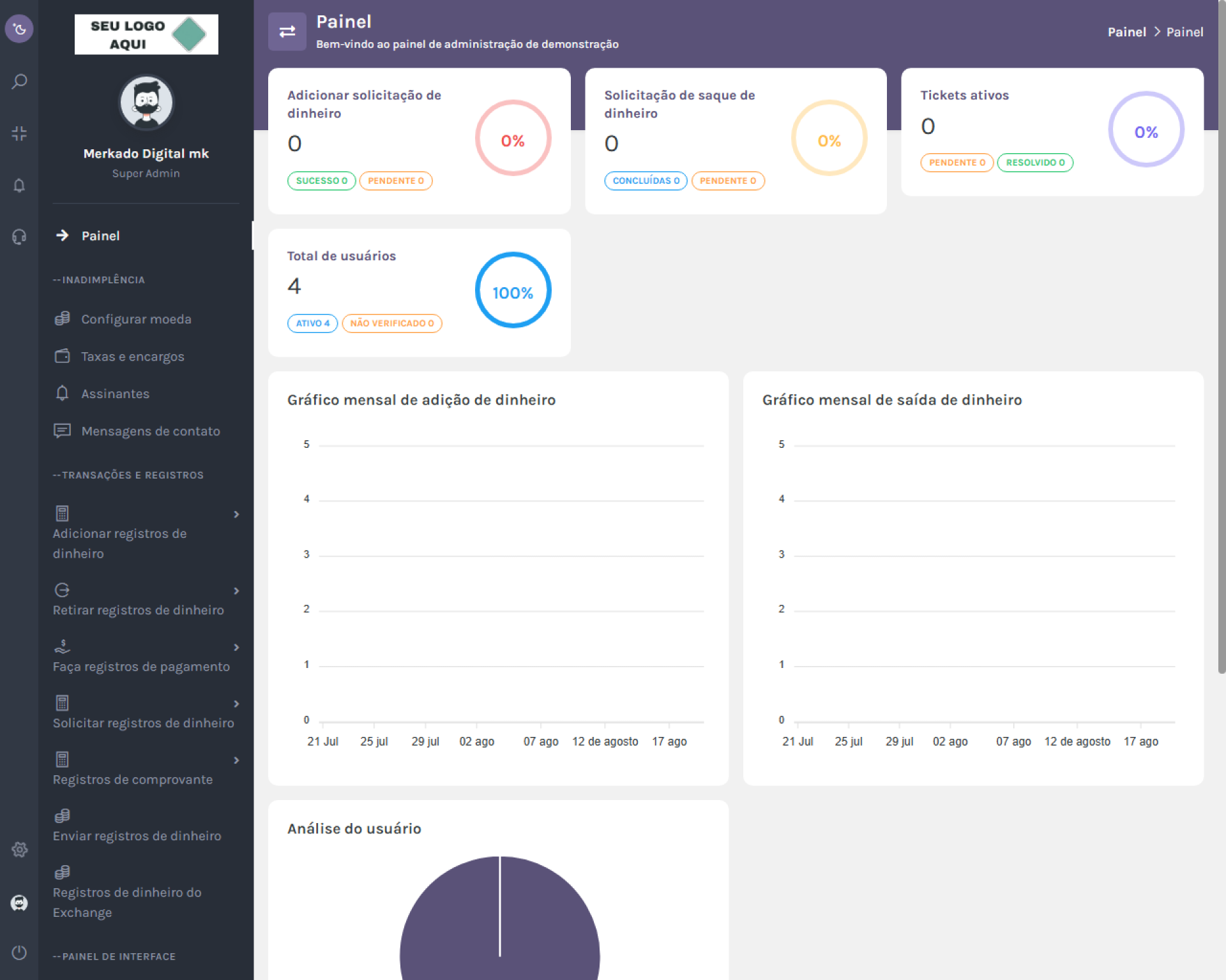 Painel de análise: Obtenha informações valiosas sobre o desempenho e o comportamento do usuário da sua plataforma. Acompanhe as principais métricas, analise dados e tome decisões baseadas em dados para aprimorar suas estratégias de negócios.