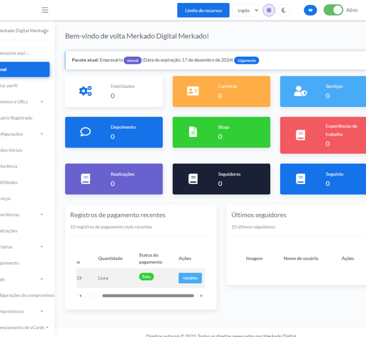 - Controle de limites para vCards, postagens de blogs, portfólios, serviços, habilidades, experiências de trabalho e educação, idiomas.