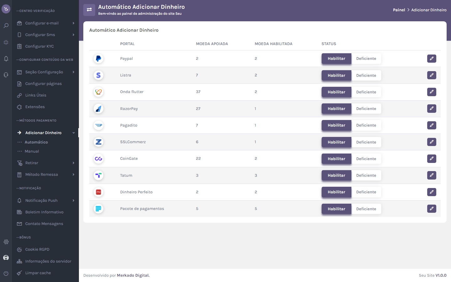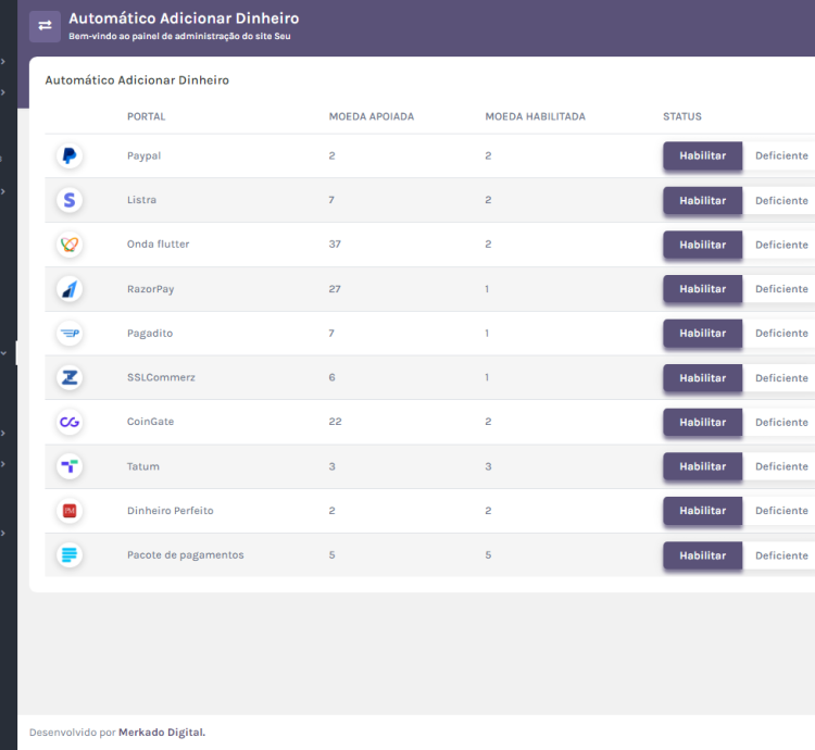 Configuração dos módulos: Habilite ou desative os recursos da plataforma com base nas necessidades do comércio.