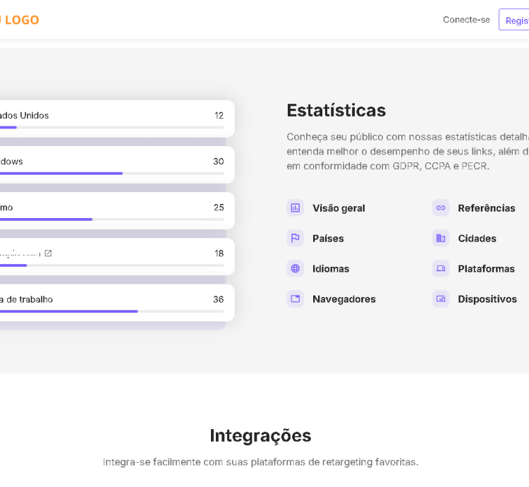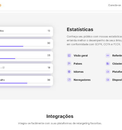 ESTATÍSTICAS – Obtenha insights analíticos para seus links sobre sua Visão Geral do Público, Referências, Países, Cidades, Idiomas, Plataformas, Navegadores e Dispositivos.