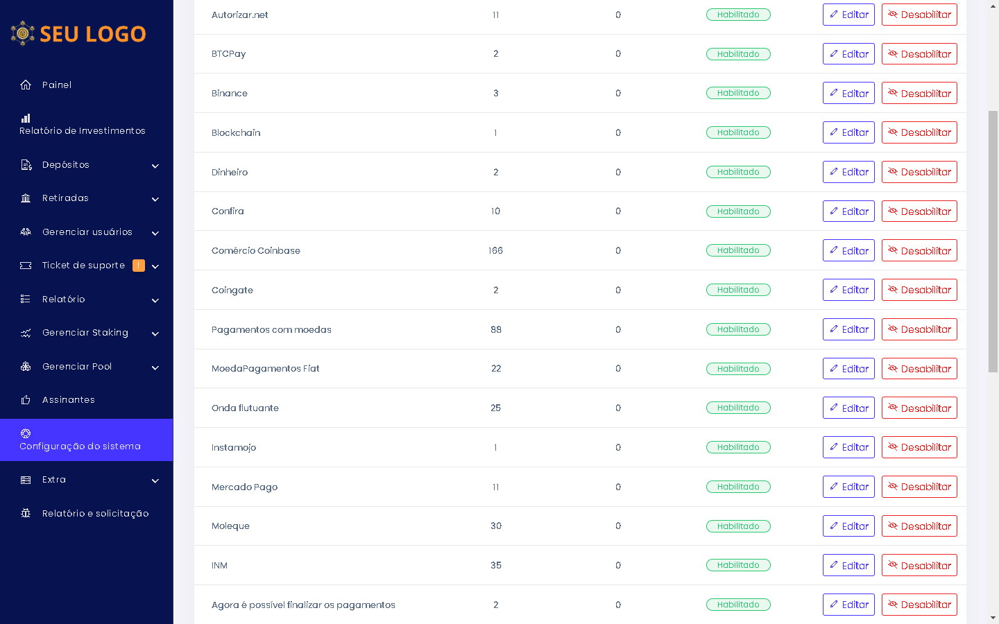 Você poderá ter uma visão geral completa do seu sistema neste painel, como quantos usuários você tem, quantos depósitos são feitos no seu sistema, quantos saques são feitos no seu sistema e etc. Além disso, você pode comparar as transações do seu sistema visualizando o gráfico.