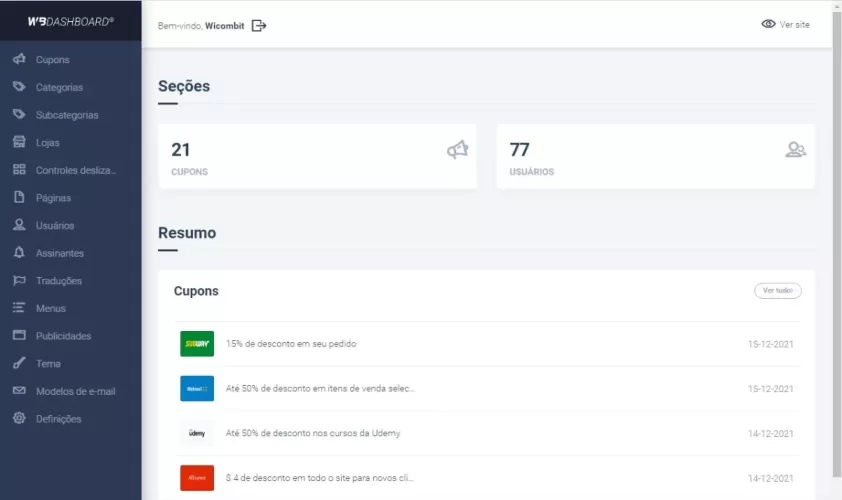 Painel de usuário amigável: onde cupons, lojas, páginas, usuários, comentários, anúncios, configurações do site, opções de tema podem ser fáceis de gerenciar.