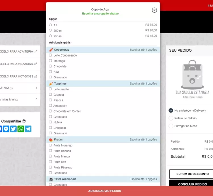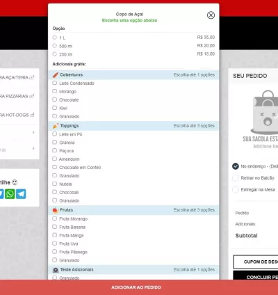 - Opções de Opcionais e Complementos: Ofereça opcionais e complementos gratuitos ou pagos, organizados por categorias, para personalizar os pedidos.