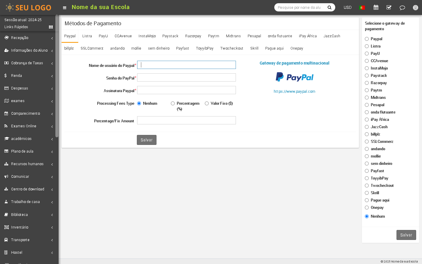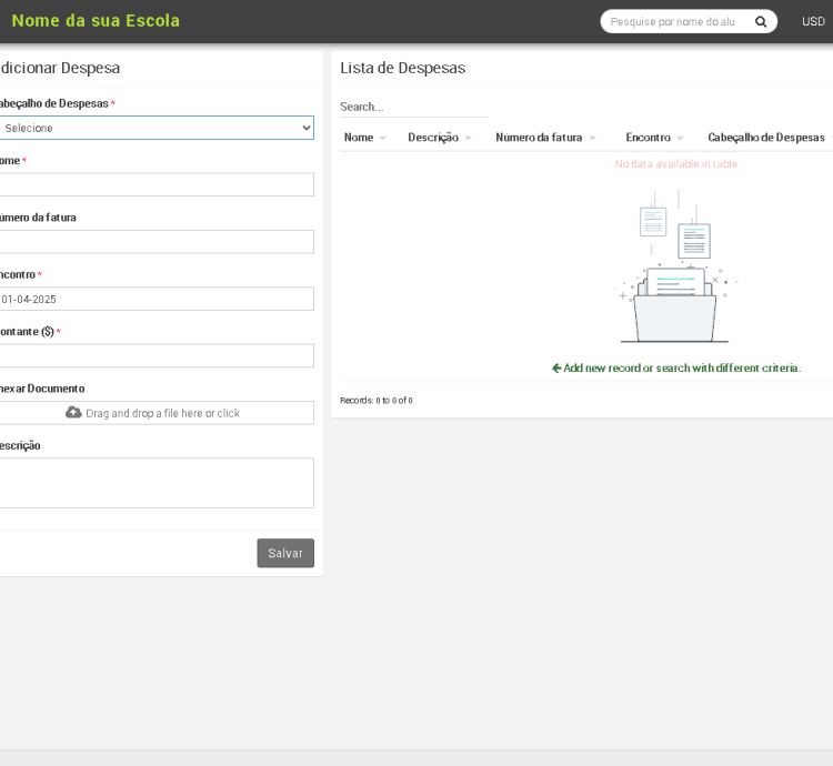 Gerencie outras receitas e despesas da escola por ordem de chegada com upload de recibos .