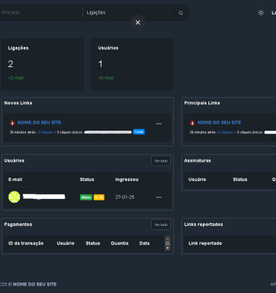 - Painel de administração completo: O poderoso painel de administração oferece controle total sobre seu site. Ele oferece a capacidade de gerenciar URLs, usuários e páginas personalizadas. Você também pode controlar todos os recursos do painel de administração, habilitando-os ou desabilitando-os com um clique de um botão. Você pode controlar Anúncios, Vários Sistemas Captcha, Frame, Sistema API, Registro de Usuário, Filtragem de URL, Temas e Manutenção e muito mais.