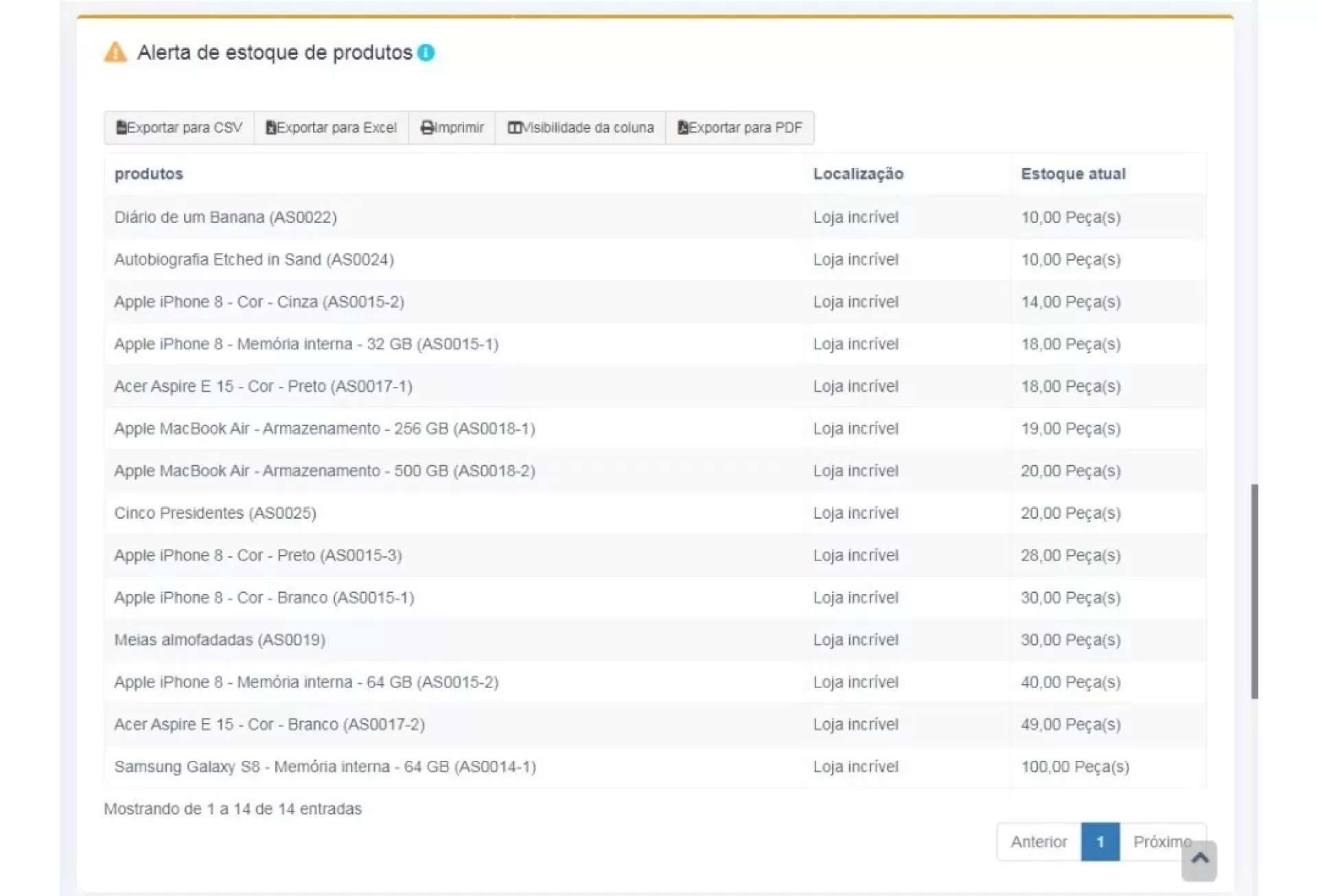 Receba alertas de estoque em estoque baixo.