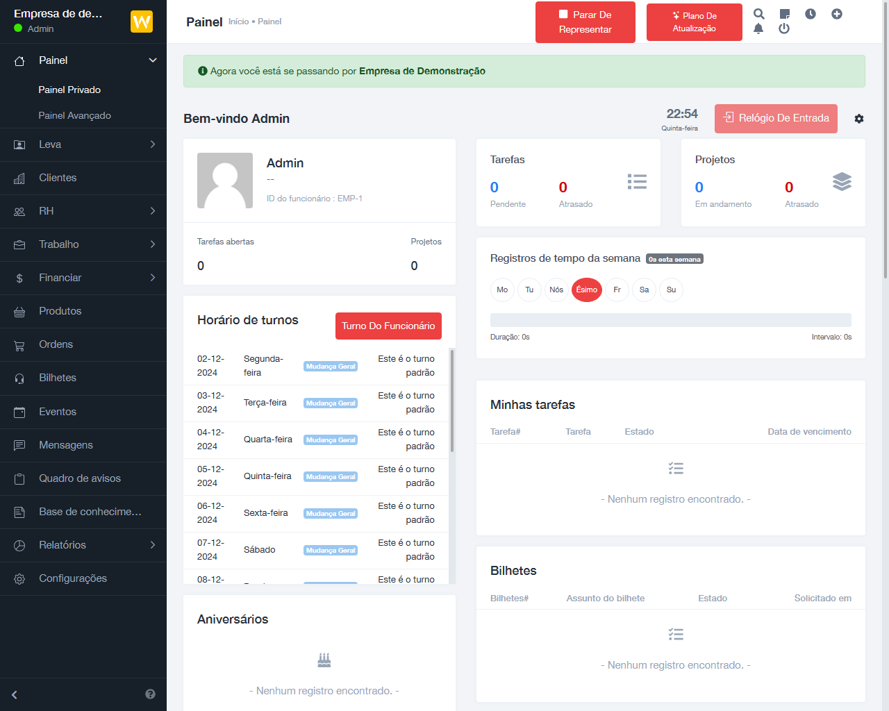 - Vários relatórios de tarefas, registros de tempo, finanças, presença e licenças