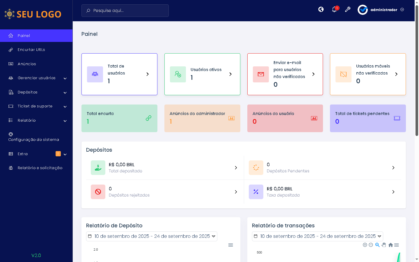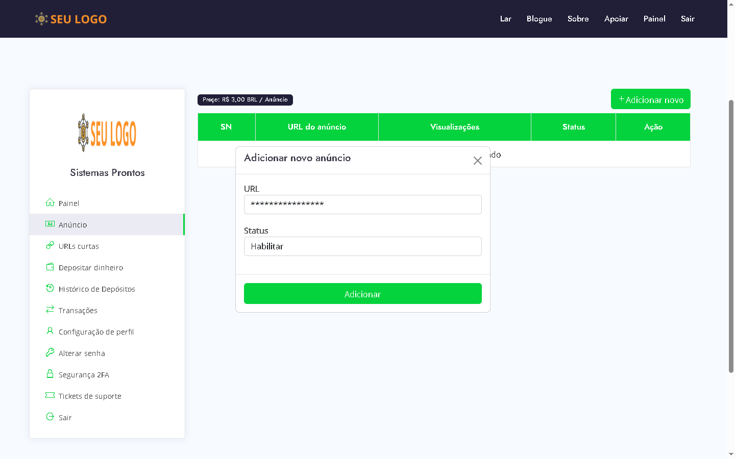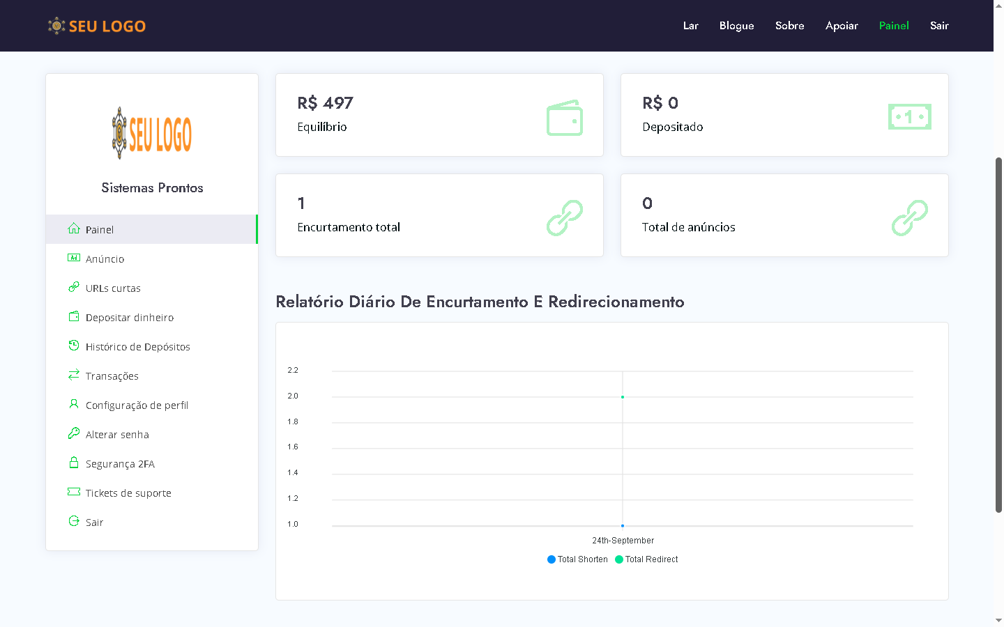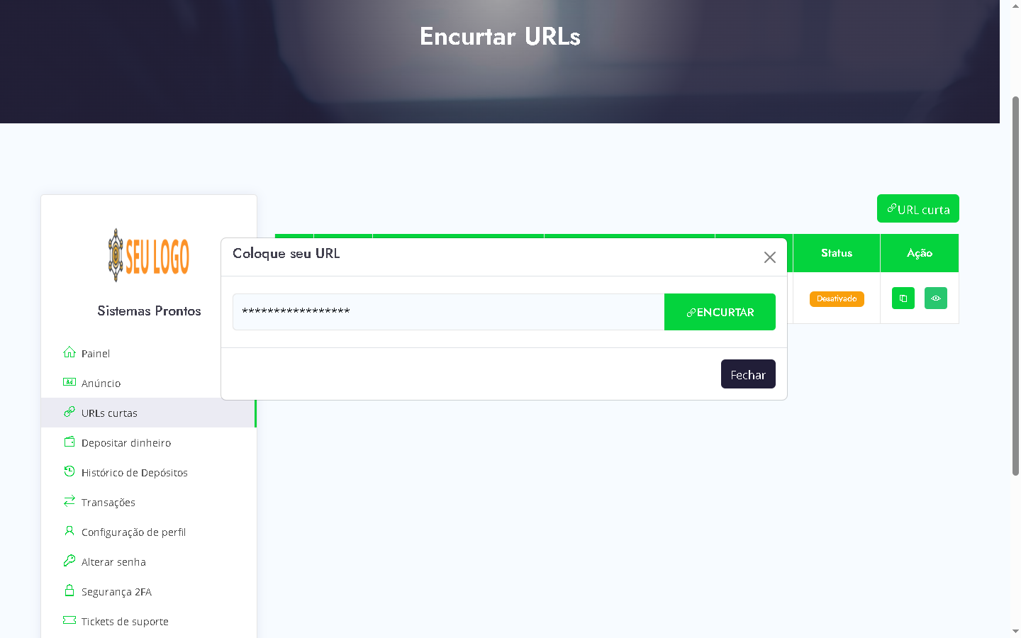 DEMO https://encurtarurl.sistemaspronto.com.br ADMIN https://encurtarurl.sistemaspronto.com.br/admin LOGIN admin Senha admin |