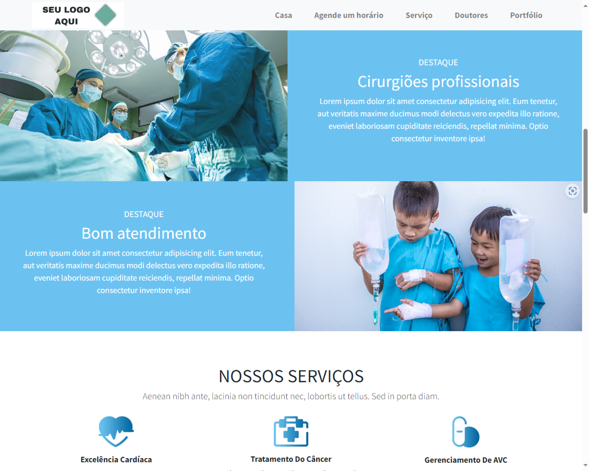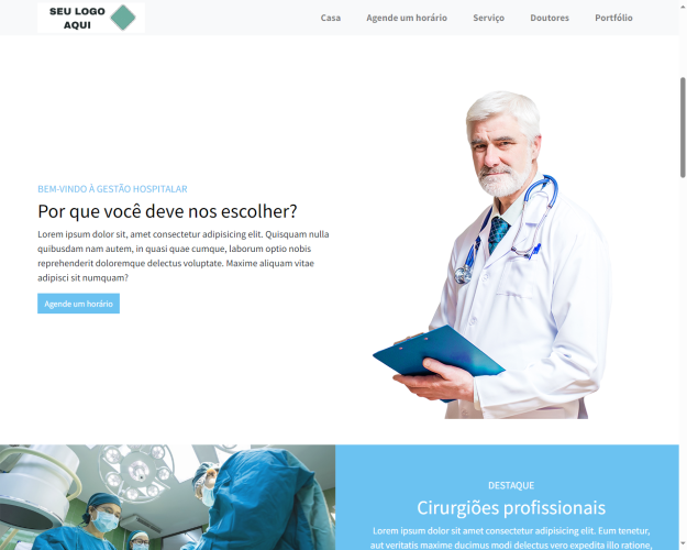 Nosso site de front-end é um site de portfólio para o hospital. Os usuários públicos podem fazer solicitação de agendamento aqui. Controles deslizantes, médicos em destaque, serviços também estão lá e podem ser adicionados dinamicamente a partir do back-end.