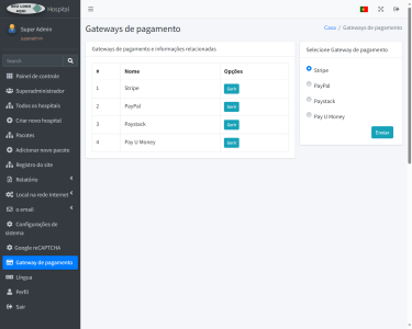 Pode alterar o título do hospital, linha de crédito, símbolo de moeda, número de telefone, endereço de e-mail, etc. Pode gerenciar gateways de pagamento, idiomas, importações em massa e backups de banco de dados.